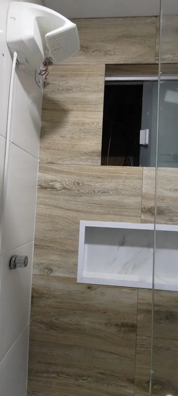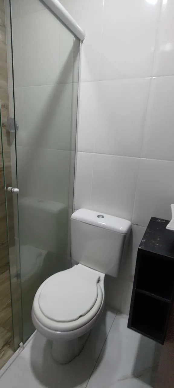 Banheiro Moderno Acabamento de qualidade e box de vidro instalado.